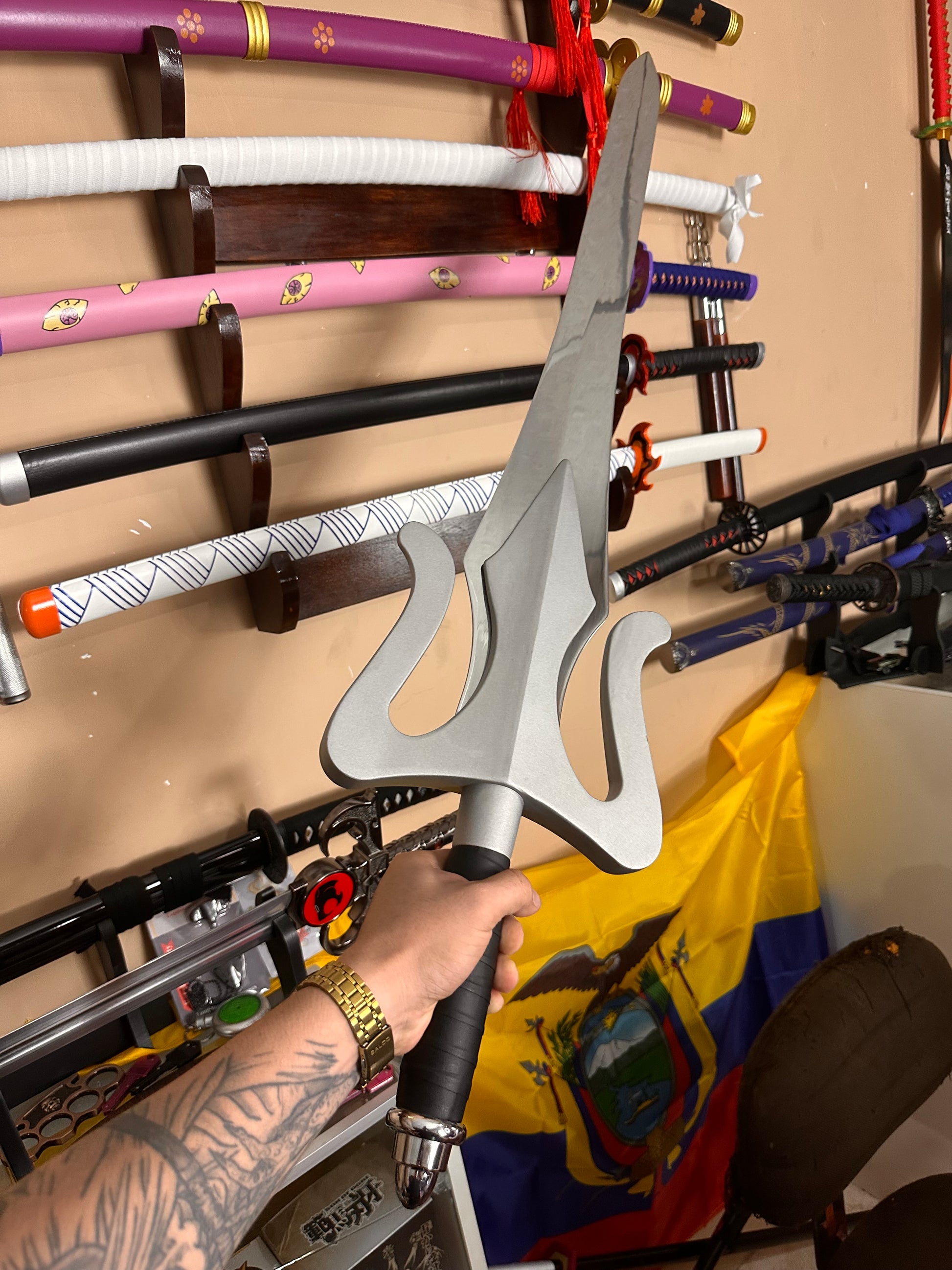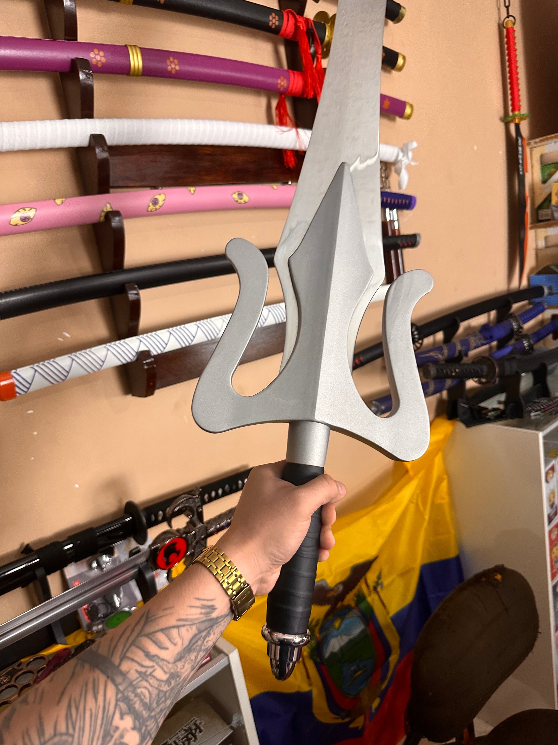 Diseño inspirado en la Espada del Poder de He-Man. Hoja ancha de acabado decorativo. Empuñadura clásica con detalles en gris. Estética fiel al arma legendaria. Ideal para exhibición, colección o cosplay.