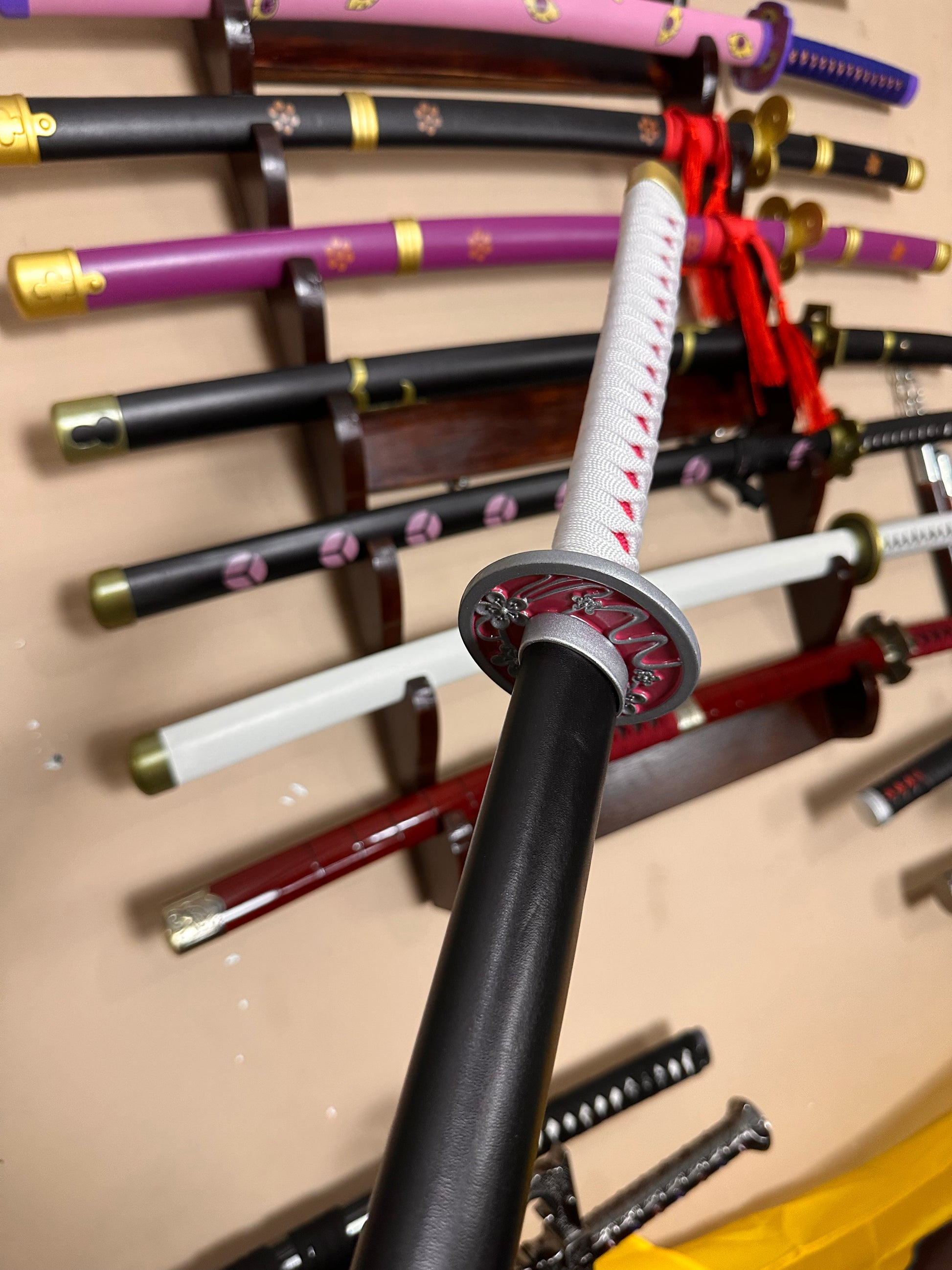 La katana se distingue por su diseño refinado y femenino, con empuñadura clara de estilo tradicional y una vaina en tonos suaves, fiel a la estética delicada del personaje. Su hoja presenta un acabado decorativo limpio, resaltando elegancia y equilibrio, mientras que el guardamanos (tsuba) circular con detalles florales añade un toque distintivo y armonioso, evocando la Respiración de la Flor.