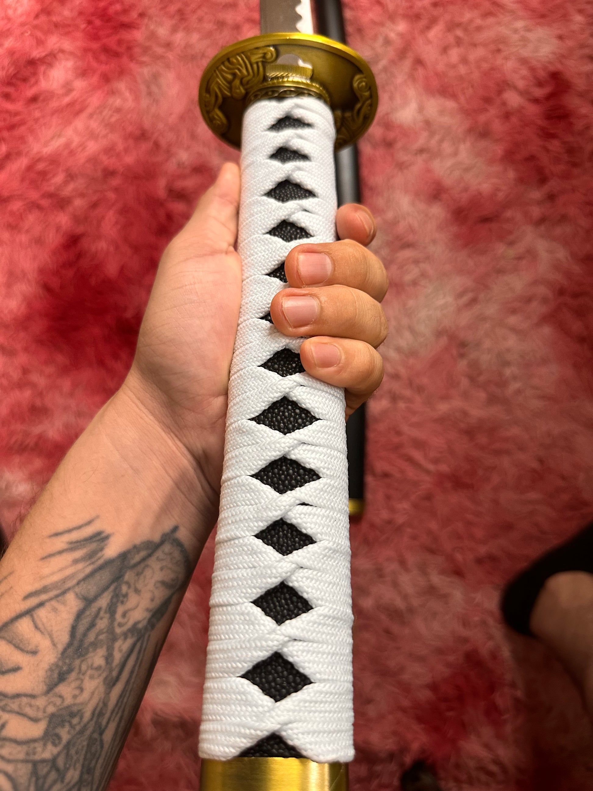 Diseño inspirado en la Katana Yamato de Vergil. Hoja decorativa sin filo. Empuñadura blanca con trenzado clásico. Vaina negra elegante con detalles dorados. Ideal para exhibición, cosplay y colección.